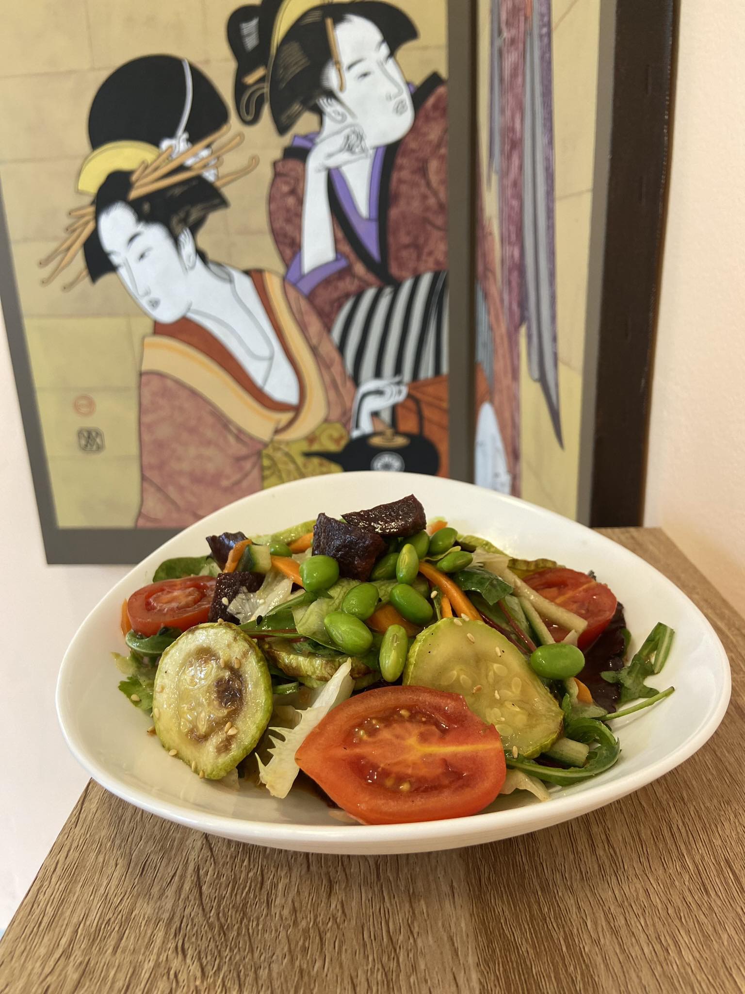 микс зелени салати, грилована тиквичка, маринован, морков, чери